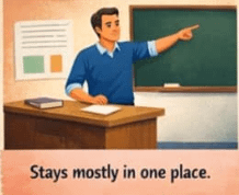 The static teacher usually stays in one place, often near the desk or the board. This teaching style focuses on structured delivery of lessons, lectures, and explanations.