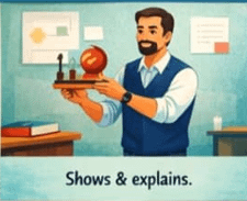 The demonstrator focuses on showing rather than just explaining. Lessons often include practical examples, experiments, or visual aids.