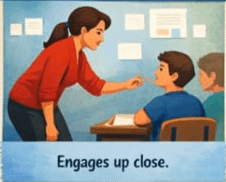 The interactive teacher actively engages with students at close range. They ask questions, listen carefully, and encourage student responses.